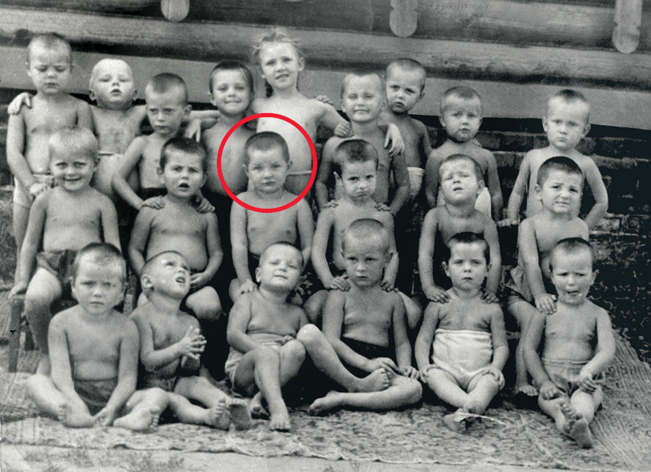 Маленькая Ирена в казахстанской ссылке семей врагов народа, обритая как и остальные дети, второй ряд, третья слева.